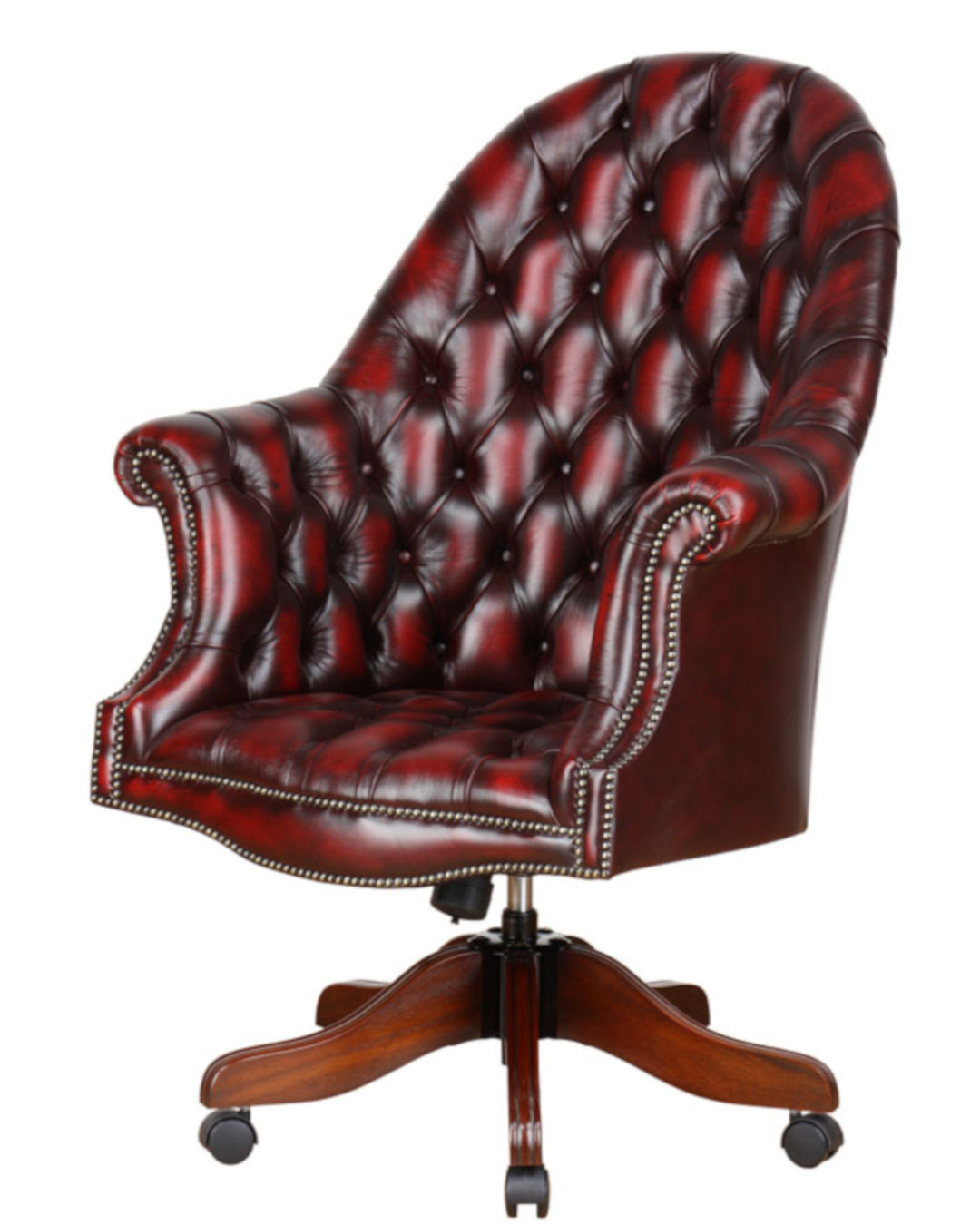 Erleben Sie mit unserem englischen Chesterfield Stuhl Tradition und Luxus. Das klassische Chesterfield-Design, die geknöpfte Sitz- und Rückenfläche und die edlen Holz Füße sorgen für einen edlen Look. Das gestell aus 100% massivem Buchenholz garantiert Stabilität, während die Drehfunktion und die Rollen den Alltag erleichtern. Verfügbar in mehreren hochwertigen Ledern, ist er der perfekte luxuriöse Bürostuhl für Ihr Büro. Hier gefertigt im Leder Red.