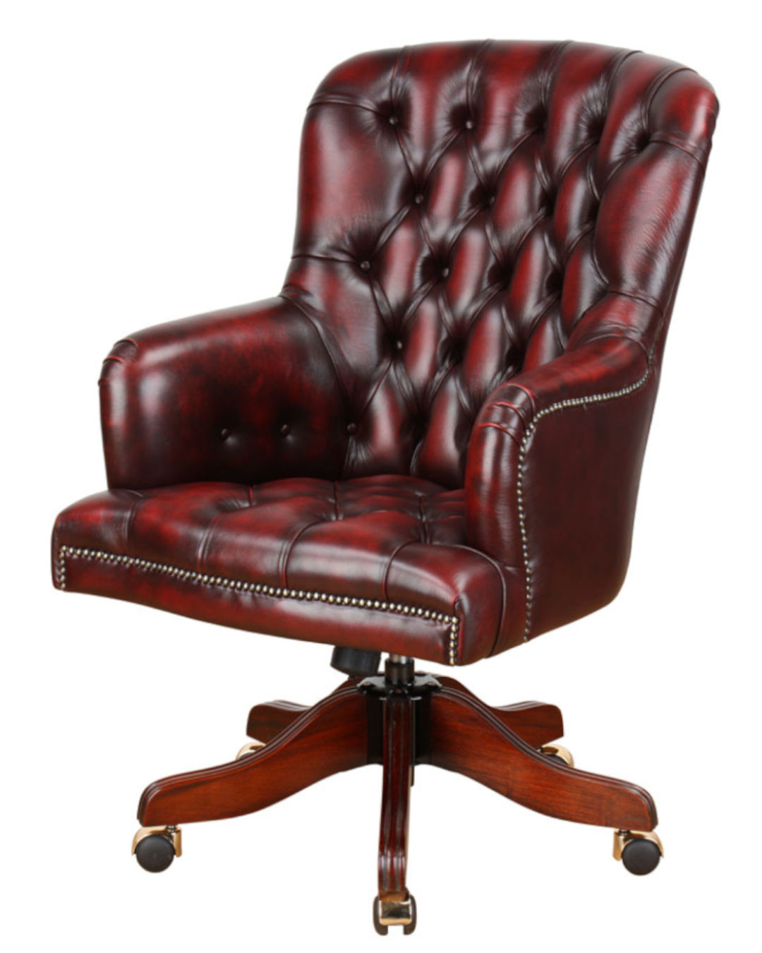 Unser Chesterfield Bürostuhl aus England kombiniert das klassische Chesterfield Design mit modernem Komfort. Die geknöpfte Sitz- und Rückenfläche, feine Holzverzierungen und das massive Buchenholzgestell machen ihn langlebig und elegant. In verschiedenen Ledervarianten erhältlich, sorgt die Drehfunktion für optimale Bewegungsfreiheit. Ein stilvoller englischer Bürostuhl, der Tradition und Luxus vereint. Hier im Leder Red