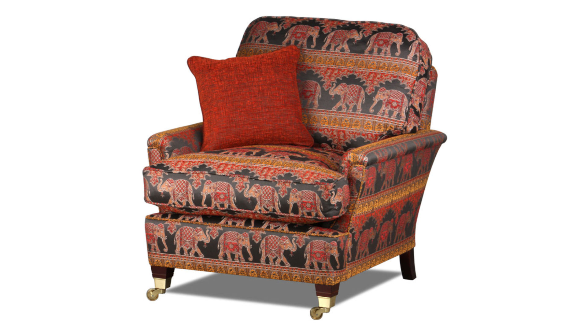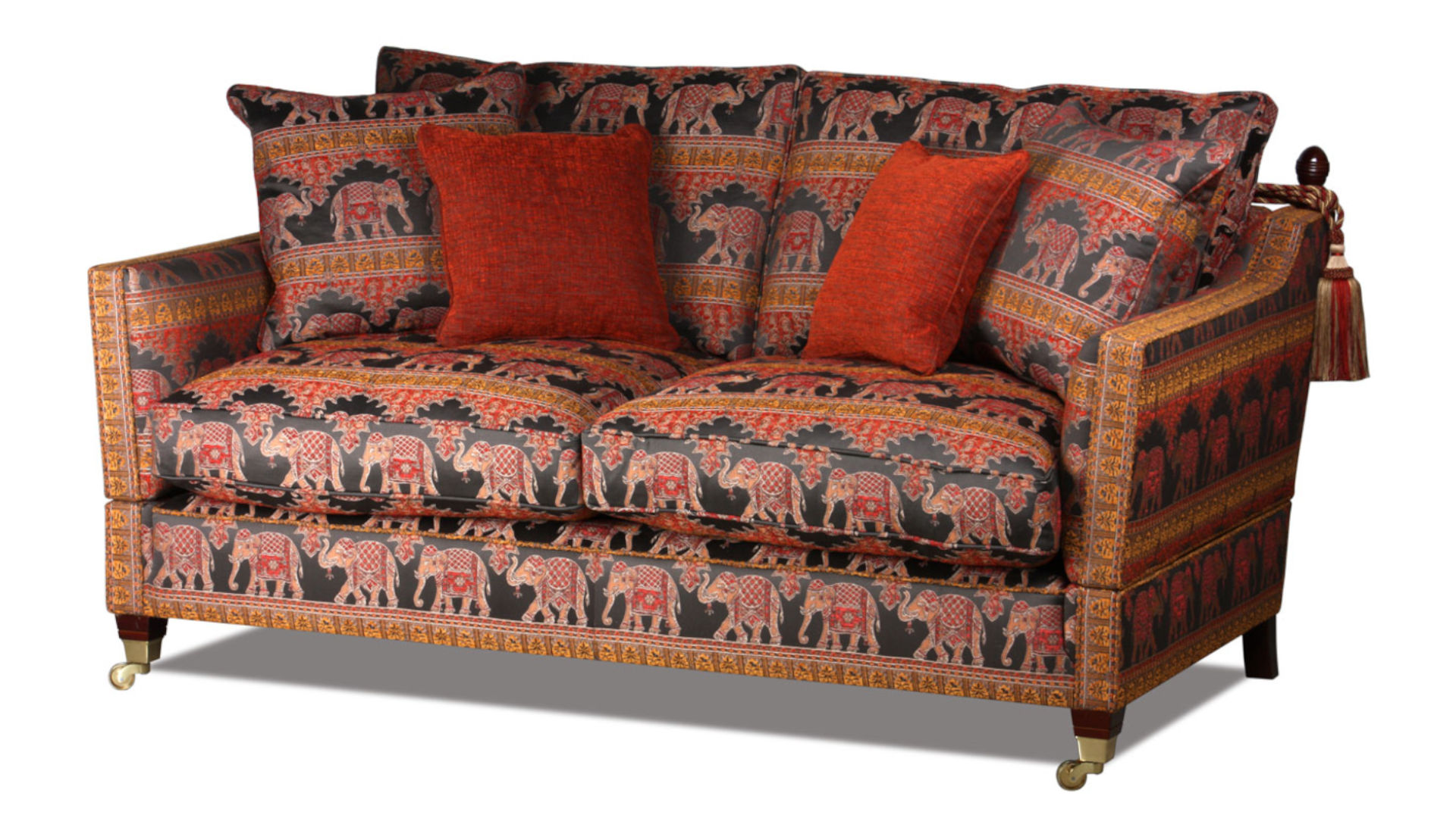 Knole Sofa mit Stoff mit orientalischen Kolonialstoff versehen mit indischen Elefants-Mustern (Ceylon Flame)