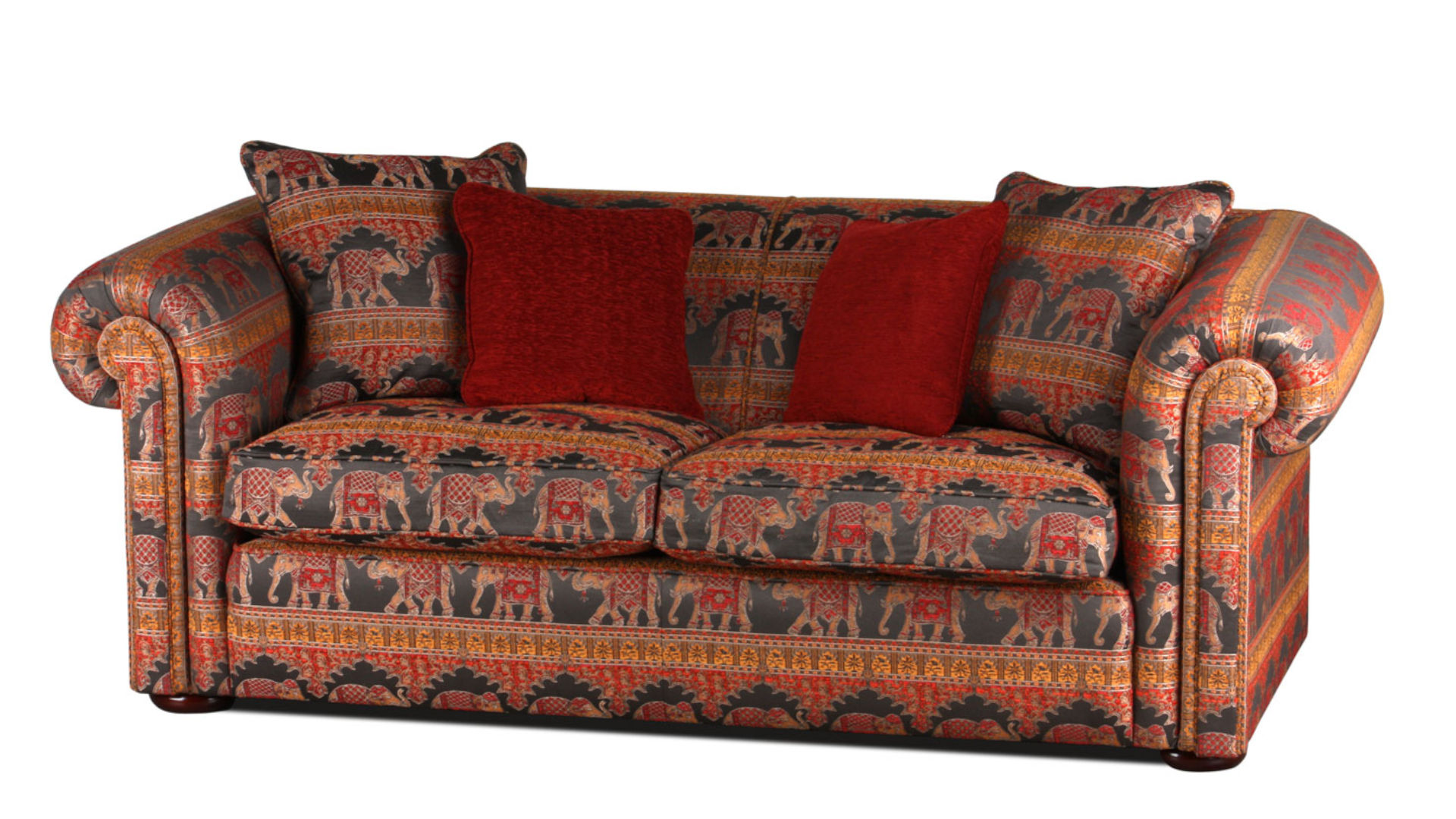 Das Metropolitan Sofa mit orientalischen Kolonialstoff versehen mit indischen Elefants-Mustern (Ceylon Flame)