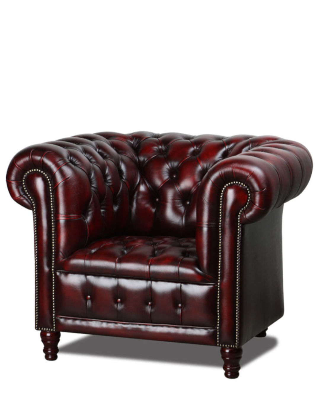Die Sitzfläche ist wahlweise mit losen Kissen oder vollständig geknöpft erhältlich und wird durch die aufwendige Ziernagelung aus einzelnen Nägeln stilvoll akzentuiert. Die Füllung des Sitzkissen kann aus weichen Entenfedern oder langlebigem synthetischem Material gewählt werden, unterstützt vom Stahlwellen-Federkern, der maximalen Komfort garantiert.