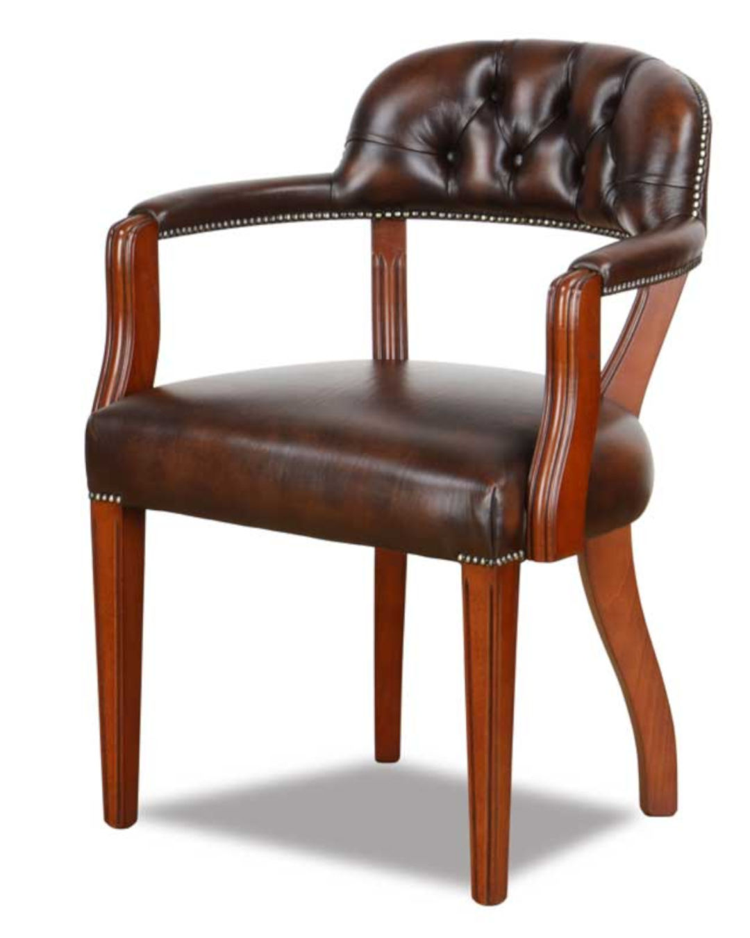 Bringen Sie mit unserem englischen Chesterfield Bürostuhl britische Eleganz in Ihr Büro. Die klassische Knopfpolsterung auf Rücken und Sitz sowie die feinen Holzverzierungen verleihen diesem Stuhl ein edles Erscheinungsbild. Das Gestell aus 100% massivem Buchenholz sorgt dank der stabilen Füße für Stabilität und langanhaltende Qualität. Die Auswahl an hochwertigen Ledern passt den Stuhl individuell an Ihr Büroambiente an. Ein luxuriöser Stuhl in echter Manufakturqualität, der Stil, Komfort und Tradition perfekt vereint. Hier gefertigt im Leder Brown.